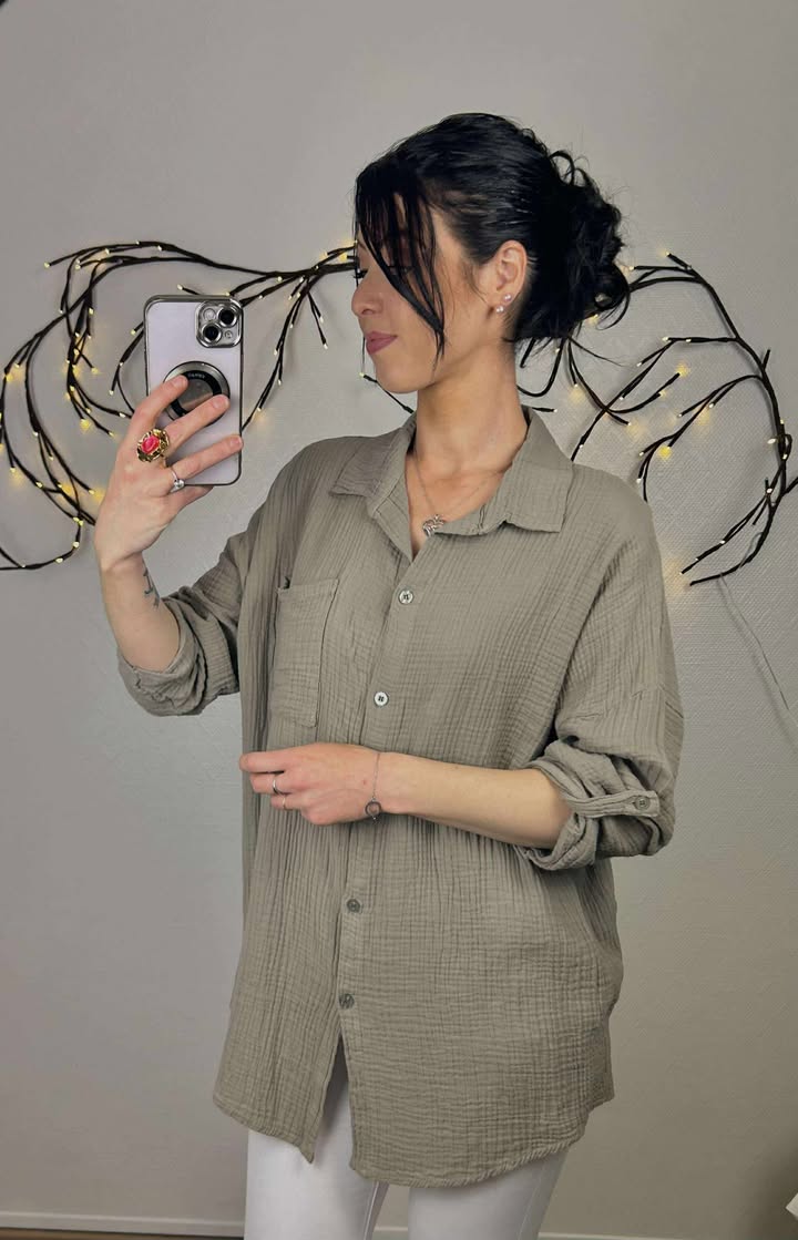 Chemise en double gaze de coton boutonnée avec une poche sur la gauche, peut se porter en manches longues ou en manches mi longues grâce à un bouton sur la manche. Demi tour de buste 65cm, longueur 77cm, peut tailler d'un 38 à un 42