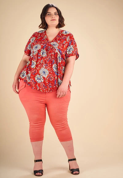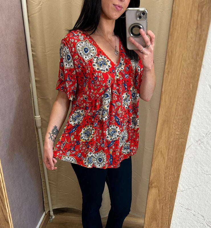 Ce top imprimé fleuri rouge doré apporte une touche de fraîcheur et d’éclat à votre garde-robe. Confectionné en 100 % polyester, il assure un confort léger et une bonne tenue tout au long de la journée. Sa coupe adaptée aux tailles L (42/44), XL (46/48) et 2XL (50/54) offre une silhouette flatteuse, idéale pour sublimer toutes les morphologies. Parfait pour une allure féminine et sophistiquée, ce top se marie aisément avec des tenues décontractées ou plus élégantes.